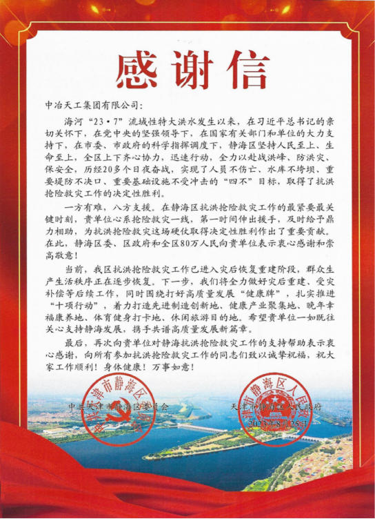近日,中冶天工收到来自静海区委、区政府感谢信,信中对中冶天工在静海区抗洪抢险救灾工作的最紧要最关键时刻,心系抢险救灾一线,第一时间伸出援手,及时给予鼎力相助表示感谢。